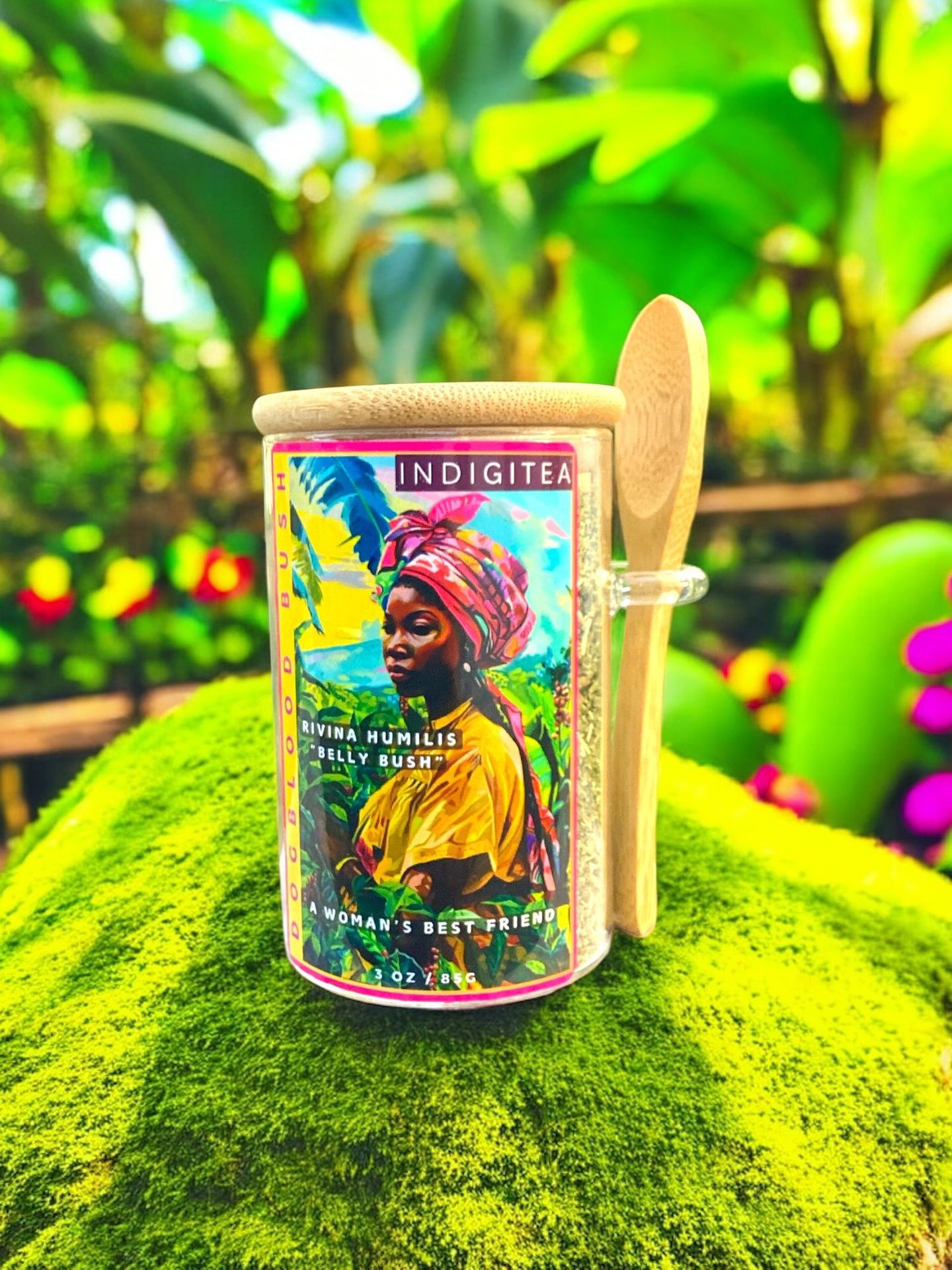 This unique herbal tea is made from the carefully dried leaves of Rivina humilis, a plant known by many names, including Dogblood bush, Belly Bush, Pickney Muma Bush, Bloodbery Bush, Period Pain Bush and Rouge plant. With its mild, earthy flavor and subtle herbal aroma, this caffeine-free tea has been used in traditional wellness practices for generations. The Maroons of Jamaica call this herb a woman's best friend. Traditionally brewed in Jamaica for vitality or "weak blood", (Morton, 1981).